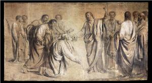 - NOTIZIE STORICO CRITICHE Il cartone, pervenuto nel 2012 in deposito al Museo Diotti, è costituito dall'unione di diversi singoli fogli utilizzati per realizzare le sinopie della Consegna delle chiavi a San Pietro nel presbiterio della Cattedrale di Cremona. Notizie sulla preparazione del cartone emergono dalle lettere scritte dal Diotti all'amico Germani e permettono di circoscrivere la realizzazione dell'opera ai mesi successivi all'aprile 1834. Il recente restauro ha permesso di salvaguardare il cartone che si trovava in precario stato di conservazione a causa della fragilità del supporto, accresciuta dalle sue monumentali dimensioni e per l'accumulo di polvere sulla sua superficie per essere stato esposto a fini didattici per numerosi decenni in un salone dell'Accademia Carrara. \nIl ciclo pittorico nel presbiterio della Cattedrale di Cremona si compone di quattro scene, l'Incredulità, l'Ascensione, il Sinite parvulos e la Consegna delle chiavi a Pietro, che impegnarono Giuseppe Diotti tra il 1830 e il 1834. Il pittore riusciva a eseguire gli affreschi nel periodo autunnale, quando era libero dagli impegni didattici. La genesi del ciclo è testimoniata da disegni (Milano, Castello Sforzesco), bozzetti ad olio (Cremona, Cattedrale) e dall'intera serie di cartoni da lui stesso donata all'Accademia Carrara.