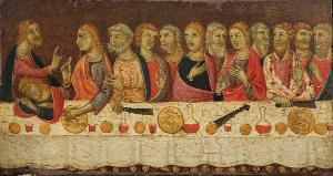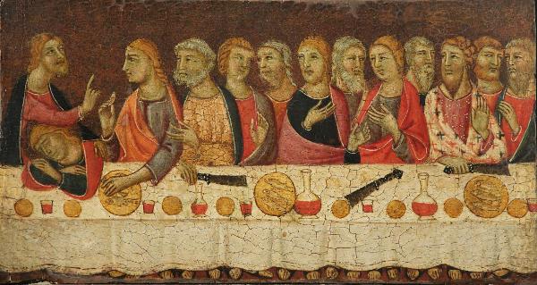 - NOTIZIE STORICO CRITICHE La particolarità di questa raffigurazione è incentrata sulla figura di Giuda, identificabile con il terzo personaggio sulla sinistra. La scena, infatti, si distacca dalla narrazione giovannea, in quanto Giuda è rappresentato mentre allunga la mano per sottrarre dal piatto di Gesù un pesce, da cui ha staccato un boccone. Questo particolare è tratto dal Vangelo di Gamaliele, uno degli apocrifi del Nuovo Testamento, focalizzato sul ciclo di Pilato (Marassini 2004; Cairati 2011).\nPer quanto riguarda la storia attributiva dell'opera, Bicchi in un primo momento la ricollega alla scuola emiliana di XIV secolo (1958), ma a seguito del restauro del 1960, la ritiene un prodotto del Trecento bolognese (1961). Invece, Ottolenghi ipotizza che l'artista sia un ferrarese attivo intorno alla metà del XIV secolo, rilevando delle tangenze con altre opere dello stesso ambito (1981). Infine, Ragghianti suppone che la tavoletta sia di ambito spagnolo e, in particolare, che sia riferibile al pittore Jaime Serra e bottega (1985).