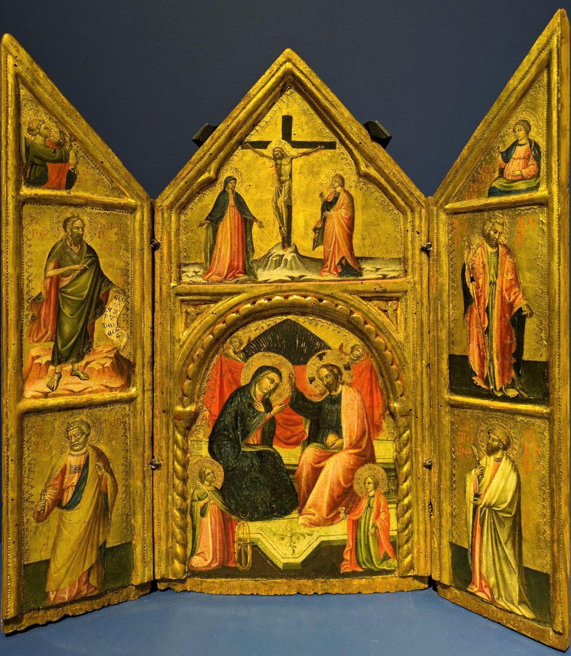 Nel pannello centrale l'Incoronazione della Vergine: Gesù Cristo, raffigurato come Salvator Mundi col globo nella mano sinistra che si appresta a benedire la Vergine, alle loro spalle un drappo sorretto da due angeli e ai piedi Santa Caterina e un'altra Santa, forse Lucia. Nella cuspide la Crocefissione: la Madonna con le braccia aperte in un gesto ampio, al centro Gesù sulla croce, a destra S. Giovanni Evangelista. Sportello di destra: in alto, Vergine annunciata a mezzo busto; al centro S. Giacomo con un bastone in una mano e un papiro arrotolato nell'altra; in basso S. Bartolomeo con il coltello, simbolo del suo martirio. Sportello di sinistra: in alto, angelo annunziante a mezzo busto; al centro, S. Giovanni Battista, vestito di pelli, con cartiglio; in basso, S. Pietro con la barba bianca e le chiavi in mano.
