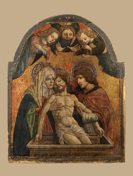 - NOTIZIE STORICO CRITICHE L' opera raffigura la scena di Pietà in cui il corpo di Cristo morto viene sorretto dalla Vergine a sinistra e da San Giovanni Evangelista a destra, sotto una schiera di angeli addolorati. Sul verso della tavola vi è un' iscrizione che riporta "ANDRIOLA DE BARRACHIS [ "di mano del sec. XVIII"]".\nAndriola de Barracchis è documentata come badessa del monastero di San Felice a Pavia tra il 1446 e il 1504, dove promosse importanti lavori di ristrutturazione, riedificazione e decorazione del complesso. In un primo momento la critica attribuì l'esecuzione dell'opera alla badessa stessa, basandosi sull'iscrizione, ma in tempi più recenti si è più propensi a interpretarla come riferimento al suo ruolo di committente e si ritiene che non sia coeva col dipinto, ma che sia stata aggiunta in un secondo momento per rimarcare il ruolo di Andriola (Tanzi 1988; Albertario 1996). Da qui spesso viene identificato l'artista col nome di "Maestro di Andriola de Barracchis" (Vannuttelli 1995).\nLa forma e l'iconografia della tavola hanno portato la critica ad interpretarla come la cimasa di un polittico (Tanzi 1988) e a ritenerla coerente con l'altra opera ricondotta al Maestro di cui sopra, anch'essa conservata presso la Pinacoteca Malaspina (P 182). In particolare, si ritiene che quest'ultima tavola, raffigurante la Madonna col Bambino in trono, angeli musicanti e monache, fosse la parte centrale del polittico. Lucco (1996) sostiene quest'ipotesi evidenziando il decentramento del trono rispetto allo spazio compositivo complessivo e deducendone che la tavola fosse stata resecata lungo il lato destro; pertanto, la sua lunghezza originaria sarebbe stata coerente con quella della Pietà. Al polittico apparterrebbero anche due figure di santi a mezzo busto, Santo Stefano (0786/D) e Santa Monica (0787/D), conservate nel deposito del Museo civico d'arte antica a Palazzo Madama a Torino. Le rispettive pose dei santi qui citati implicano anche un ipotetico posizionamento delle tavole nel registro superiore del polittico (cfr. immagine allegata): Santo Stefano raffigurato in diagonale, quasi a suggerire l'andamento prospettico della profondità, doveva essere collocato verso l'esterno, mentre, Santa Monica, più frontale, doveva collocarsi più immediatamente vicina al centro (Lucco 1996).