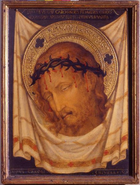 - NOTIZIE STORICO CRITICHE La tavola ritrae il volto di Cristo, addolorato e coronato di spine, impresso sul Velo della Veronica; nella parte superiore e inferiore dell'opera vi sono due iscrizioni.\nIn un primo tempo, la critica, considerando la scritta apocrifa sul margine inferiore della tavola, attribuì l'opera a Carlo Crivelli. Tuttavia, analizzando la dolcezza dei tratti del volto, la delicatezza delle carni e il raffinato linearismo del Cristo, si è evidenziato come questi tratti non siano pertinenti con lo stile del Crivelli. Fu, infatti, Fiocco (1920) per primo a sottolineare come l'iscrizione non fosse autentica e ad indirizzare l'opera verso Michele Bono, detto Giambono (Savy 2010).