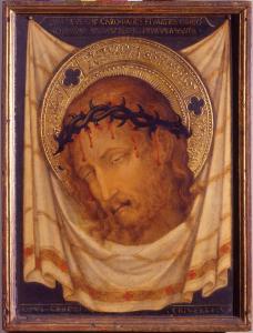 Viso di Cristo, coronato di spine, impresso sul velo della Veronica. L'aureola ed i due chiodi finti, ai quali è appeso il panno bianco con bordi dorati e fiori rossi, sono a rilievo dorato; dorate sono anche le due iscrizioni, in cartigli simili tra loro, apposti in alto e in basso sulla tavola.