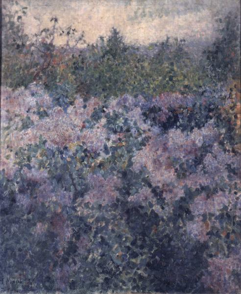 - NOTIZIE STORICO CRITICHE Lilla, datato 1901, propone una rigogliosa fioritura indagata negli aspetti cromatici e luministici, senza alcun interesse per la resa di profondità, spazi e volumi. La pennellata si compone di piccoli tocchi di colore accostati, in una maniera grumosa vicina al puntinismo di Camille Pissarro alla fine degli anni Ottanta dell'Ottocento, per l'attenzione ai fattori intermedi tra i colori complementari. Per questo, il dipinto va posto a confronto con gli esiti della pittura impressionista francese e con la sua evoluzione post impressionista, piuttosto che con il divisionismo italiano.\nLilla, datato 1901, propone una rigogliosa fioritura indagata negli aspetti cromatici e luministici, senza alcun interesse per la resa di profondità, spazi e volumi. La pennellata si compone di piccoli tocchi di colore accostati, in una maniera grumosa vicina al puntinismo di Camille Pissarro alla fine degli anni Ottanta dell'Ottocento, per l'attenzione ai fattori intermedi tra i colori complementari. Per questo, il dipinto va posto a confronto con gli esiti della pittura impressionista francese e con la sua evoluzione post impressionista, piuttosto che con il divisionismo italiano. Esposto alla "Mostra individuale dei Serafino Macchiati, Siro Tofanesi, Mario Sotgia" nel maggio 1923 alla Galleria Pesaro (Milano).