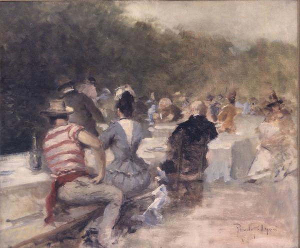 - NOTIZIE STORICO CRITICHE Il dipinto fu acquistato dai coniugi Morone presso il collezionista pavese Luigi Molina. Rappresenta un momento di svago all'aperto della buona borghesia: il soggetto rientra tra quelli prediletti di Pellegrini, ed è interpretato con tocco guizzante e colore mosso e liquefatto, che richiama le ultime opere condotte en plein air da Mariano Fortuny e da Domenico Morelli, maestro di Pellegrini. \nL'immediatezza della composizione, con i personaggi colti di spalle a loro insaputa, senza il tempo di assumere pose studiate ed eleganti, rimanda anche alle molte scene all'aperto sulle rive della Senna di Manet e di Renoir, seppure senza della solida costruzione del primo e senza i colori brillanti del secondo. Tuttavia, Pellegrini seppe costruire una sua maniera, elegante e piacevole, che ne decretò la fortuna presso il collezionismo privato.