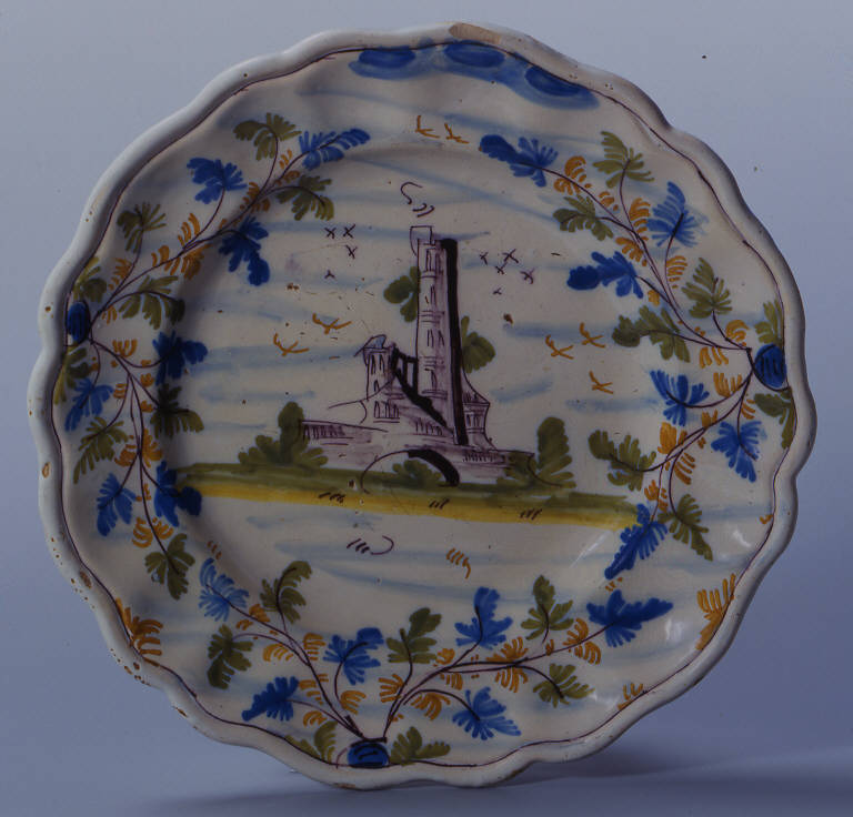 • NOTIZIE STORICO CRITICHE Lo stilema decorativo a 'castelletto' è largamente diffuso a Pavia e a Lodi nella seconda metà del XVIII secolo. Numerose le collezione private che conservano da sempre questi piatti. Esemplari di questo tipo sono conservati presso il Collegio Borromeo di Pavia.