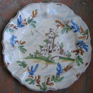 Piatto con bordo mistilineo sagomato e leggermente costolato in maiolica policroma