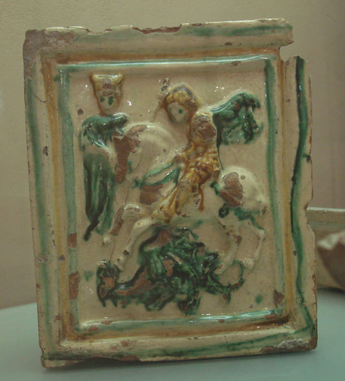 - NOTIZIE STORICO CRITICHE Formella in ceramica policroma per stufa foggiata a stampo con raffigurato San Giorgio a rilievo.Le stufe a formelle ceramiche erano particolarmente diffuse in aree di influenza tedesca come il Trentino Alto Adige.
