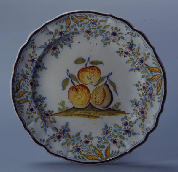 Piatto ovale mistilineo sagomato e costolato in maiolica con decorazione 'alla frutta' al centro del cavetto, intorno rami fioriti. Bordo profilato in bruno di manganese