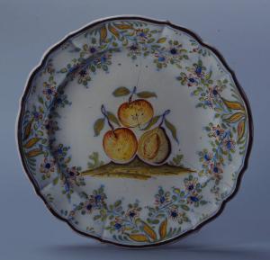 - NOTIZIE STORICO CRITICHE La tipologia decorativa 'alla frutta' si trova anche a Lodi. Per distinguere le due produzioni, cosa non facile in mancanza di marche, è necessario esaminare le forme di piatti e vassoi, dato che Pavia e Lodi utilizzavano forme diverse. \nUn piatto decorato 'alla frutta' e marcato sul retro 'Pavia' è citato da Camillo Brambilla nel suo 'Antonio Maria Cuzio e la ceramica in Pavia' (1889), come di proprietà del nobile Giuseppe Folperti.