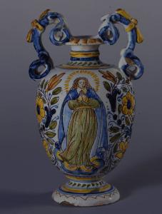 - NOTIZIE STORICO CRITICHE La tipologia decorativa con la figura della Vergine e Santo Vescovo in giallo e azzurro su smalto bianco e i motivi floreali intorno alle due figure riconduce a stilemi tardo compendiari ancora in uso a Castelli d'Abruzzo nella seconda metà del XVII secolo.