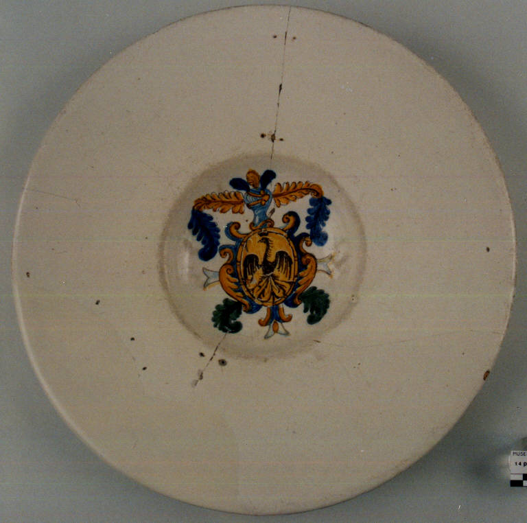 - NOTIZIE STORICO CRITICHE A Pavia è documenta la presenza di maestranze faentine che importano in città (fine XVI - inizi XVII secolo) il nuovo e rivoluzionario stile compendiario inventato dai ceramisti di Faenza (nuova attenzione alle forme che imitano i più sontuosi argenti e la messa a punto di un candido e cremoso smalto bianco con stagno come opacizzante). Nel 1634 a Pavia è presente Scipione Tamburino (o Tamborno) definito come 'Maestro da maiolica', un caso unico nelle carte pavesi, personaggio di spicco nel mondo della maiolica perché già nel 1616 è attestato che produceva (prima ad Ostiglia e poi a Mantova) maiolica di qualità per il Duca Gonzaga. Ed in questi anni non può che trattarsi, per Pavia, di maiolica 'alla faentina'. Inoltre i documenti d'archivio trovano conferma nei numerosi cocci e scarti di fornace di maiolica 'alla faentina' ritrovati durante gli scavi di archeologia urbana (di cui il più ricco ed importante è lo scavo per il collettore fognario del 1976 sul Lungoticino). A Pavia si producono soprattutto 'bianchi' araldici. \nLo stemma araldico potrebbe essere quello della nobile famiglia Martinengo (C. Marozzi, 'Stemmario delle famiglie nobili di Pavia e del Principato').