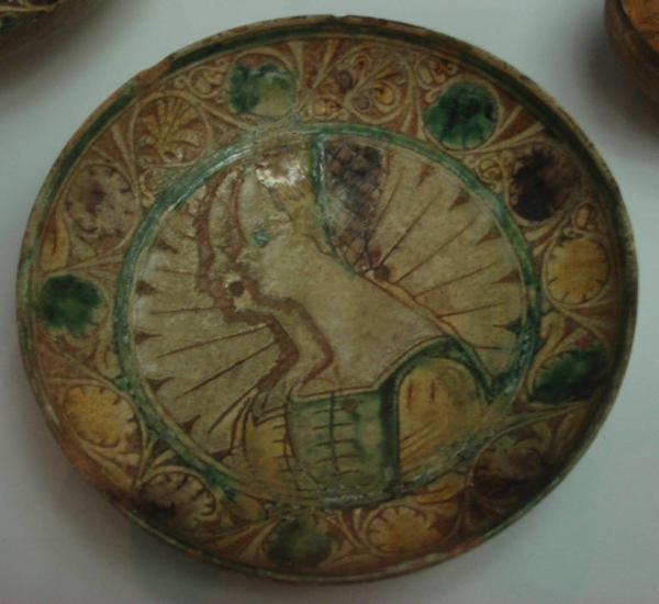 - NOTIZIE STORICO CRITICHE La decorazione è eseguita 'a graffito' a 'punta' e a 'stecca'. La policromia è ottenuta con il verde ramina, il giallo ferraccia, il bruno di manganese. Il verso, ingobbiato e con vetrina fino al piede, presenta un filetto in verde e due righe graffite sotto l'orlo. Il piede, ingobbiato e invetriato anche all'interno, è leggermente umbonato. Pavia produce una gran quantità di 'graffita padana' a partire dal XIII/XIV secolo fino al XVII, quando si hanno ancora tarde manifestazioni. La produzione pavese si distingue per l'abbondanza e la qualità. Il sottosuolo cittadino infatti continua a restituirci reperti di graffite sia monocrome che policrome.