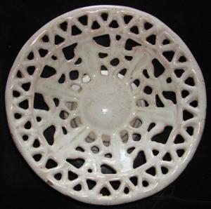 Coppa su alto piede svasato e modanato con ampia parete traforata ad orlo estroflesso in maiolica bianca 'alla faentina'.