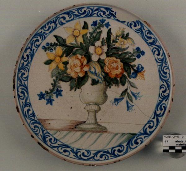 - NOTIZIE STORICO CRITICHE La forma dell'alzata è ancora di sapore seicentesco, ma la decorazione e soprattutto il bordo a ramages denunciano l'appartenenza all'inizio del XVIII secolo.La decorazione policroma al centro dell'alzata raffigura in modo un po' goffo ed ingenuo un grosso mazzo di fiori in un vaso a balaustro appoggiato su un gradino di marmo. \nL'esemplare rientra a tutti gli effetti nella produzione delle fornaci pavesi sia per la forma ad alzata di cui sono noti parecchi esemplari realizzati con i decori più vari; sia per il ductus pittorico che è di matrice profondamente locale; sia per le tonalità del cromatismo. D'altronde gli inventari settecenteschi pavesi documentano la presenza di maiolica 'alla lodigiana' ed anche 'a fioretti'.