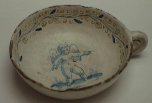 Ciotola a calotta con piede ad anello ed ansa ad occhiello in maiolica bianca 'alla faentina'