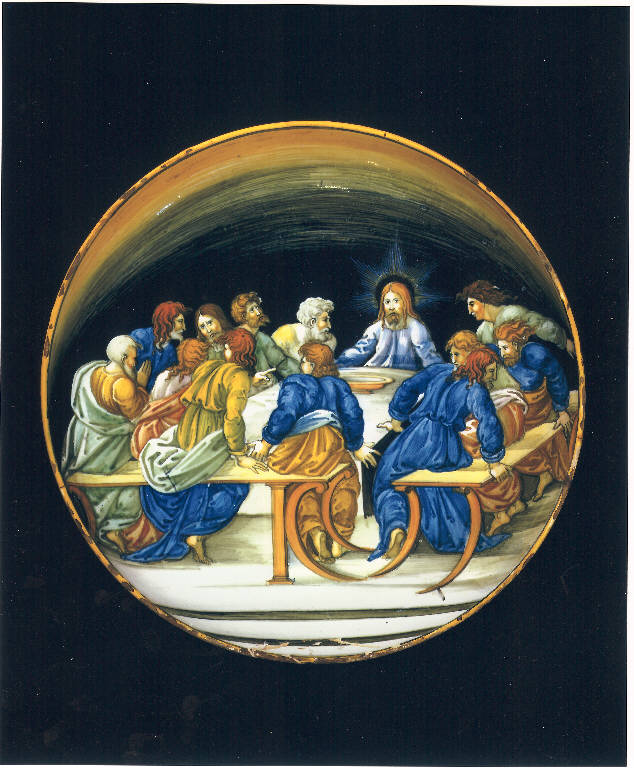 - NOTIZIE STORICO CRITICHE La preziosa targa in maiolica istoriata con l'Ultima Cena viene realizzata da Nicola di Urbino (identificato con Nicola di Gabriele Sbraghe) intorno al 1530. E' ascritta al maestro urbinate, considerato il più abile fra i pittori di ceramiche del Rinascimento, tanto da esse soprannominato il "Raffaello della maiolica" e anche il "principe dei ceramisti del Cinquecento", sulla base del confronto stilistico con la produzione sicuramente autografa/ di mano di Nicola. Sono infatti ben riconoscibili i segni inconfondibili dell'autografia di Nicola: la finezza di esecuzione, il segno graficamente accurato, la straordinaria qualità pittorica, la preziosità del cromatismo brillante e l'abilità nella resa spaziale contraddistinguono l'eccellente produzione dell'urbinate. \nTipici del maestro sono anche gli incarnati sfumati, le lumeggiature bianche che sottolineano i profili dei nasi alla greca e i capelli dalle ciocche ben delineate.\nCiò che affascina maggiormente nell'Ultima Cena è l'abile scelta degli accostamenti cromatici, le tinte accese e cangianti, l'alternarsi e richiamarsi di colori freddi e colori caldi.\nConfrontando la gamma cromatica della targa pavese con i colori di alcune opere certe del maestro, si avverte una variazione di tonalità, tipica dell'ultimo periodo di attività dell'artista. All'inizio della sua produzione, intorno al 1520, le tinte sono più chiare e pure, mentre dal 1930 si fanno più cangianti e si arricchiscono di sfumature. Dalla tonalità blu pastello passa ad altri timbri cromatici fra cui risalta un verde cangiante, arricchito di sfumature con il giallo; per contro il giallo è chiaroscurato con il verde. A partire da questa data Nicola si avvale, all'interno della ormai avviata bottega, di collaboratori, tra i quali forse Francesco Xanto Avelli da Rovigo, altrettanto celebre ceramista e colto umanista rinascimentale, che secondo la critica potrebbe aver avvicinato Nicola a queste nuove cromie. Le vesti drappeggiate degli Apostoli nella placca pavese sono dipinte con colori cangianti vicini a quelli usati da Xanto.\nLa formella è compresa entro un bordo dipinto di nero, probabilmente destinato ad essere coperto da una cornice ed appeso come un dipinto su tela; queste targhe istoriate sono molto diffuse e di gran moda negli anni 1930 e 1940. L'argilla utilizzata presenta una colorazione paglierino rosato chiaro, ben depurata, in uso presso le botteghe ceramiche attive ad Urbino nel corso del XVI secolo.\nLe fonti iconografiche cui attinge Nicola sono i repertori di incisioni tratti soprattutto da disegni di Raffaello, ma anche le xilografie della Bibbia e dei testi classici, molto diffusi nelle botteghe ceramiche, che ben assimila e reinterpreta. Per l'Ultima Cena, in particolare, il rimando è all'omonimo affresco della tredicesima campata delle Logge Vaticane di Raffaello (attribuito a Vincenzo Tamagni da un modello di Perin del Vaga), di cui ripropone l'esatta trasposizione. Se si esclude una visione diretta, Nicola potrebbe aver visto i disegni delle Logge di Giulio Romano che nel 1524 sosta a Urbino. \nLa stessa scena identica si ritrova nella coppa del Kunstindustrimuseet di Copenaghen, dalle tinte cangianti e forti, l'unico cambiamento rispetto alla placca pavese è costituito dall'accorgimento di due gradini in primo piano che servono a dare profondità prospettica alla scena. \nLa rara targa pavese, realizzata a Urbino, il più importante centro di produzione di maiolica istoriato del Cinquecento, proviene dalle raccolte del marchese Luigi Malaspina di Sannazzaro (1754-1835), mecenate e collezionista illuminato di antichità, esposte nello Stabilimento Belle Arti Malaspina. Il nucleo di maioliche del nobile pavese è formato da pochi pezzi, ma tutti di notevole qualità. Nel catalogo redatto da Giovani Monti, custode e conservatore del gabinetto di Belle Arti, è annotato che la targa presenta la marca "E.M.", che non trova nessun riscontro. Probabilmente Monti interpreta erroneamente il sigillo in ceralacca rossa presente al verso, con un'aquila bicipite coronata, recante tra gli artigli uncinati gli emblemi del potere (globo e doppio scettro) e al centro, entro un clipeo, le iniziali capitali maiuscole "F.I.", riferibili all'imperatore Francesco I d'Austria. Sulla bordura, parzialmente leggibile, l'iscrizione "...di Milano ... Esportazione". Con probabilità si tratta di un timbro di esportazione legato alle vicende collezionistiche della targa.\nL'Ultima Cena fu acquistata dal Malaspina presumibilmente sul mercato d'arte milanese, nel lasso di tempo tra il 1832 (la targa non compare infatti nella prima stesura del catalogo delle collezioni, ma solo in un manoscritto autografo) ed il 1835 (anno della morte del marchese).