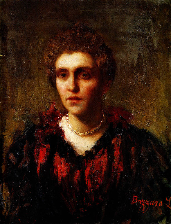 - NOTIZIE STORICO CRITICHE Il dipinto ritrae Corona Douglas Scotti della Scala, moglie del Bazzaro e più volte protagonista delle tele del pittore. Tra i ritratti della nobildonna più noti, vi è quello conservato presso la galleria d'Arte Moderna di Milano, riconducibile agli inizi del Novecento (L. Caramel, C. Pirovano. Galleria d'Arte Moderna. Opere dell'Ottocento, Milano 1975, tav 135). Sembra lecito ipotizzare che il dipinto, sicuramente pensato per una destinazione privata, abbia una datazione intorno agli anni 1910-1915. Probabilmente la tela ha partecipato alla mostra postuma dedicata a Bazzaro alla Società Permanente di Milano nel 1939: nel catalogo, che comprende duecentodieci opere dell'artista, compaiono sei ritratti della signora Corona Bazzaro, per lo più successivi al 1910.
