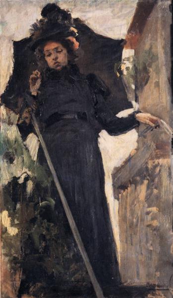 - NOTIZIE STORICO CRITICHE L'opera è pubblicata per la prima volta nel catalogo La collezione Morone (La collezione Morone, Milano 2002, scheda n. 56). Ritirata dal corniciaio milanese Luigi Bosoni, la grande tela aveva colpito i coniugi Morone per l'originalità dell'inquadratura e l'eleganza della figura. L'abbigliamento della donna ritratta, fa propendere per una datazione ai primi anni del Novecento, periodo nel quale il pittore, dopo un esordio accademico, si era avviato, anche per esigenze di mercato, a una produzione di paesaggi, ritratti, scene all'aperto spesso di soggetto rurale.