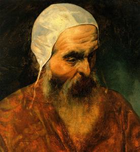Mezzo busto di uomo vecchio con viso, solcato dalle rughe, rivolto verso sinistra, in atteggiamento pensoso; ha lunghi baffi, una lunga barba, una cuffia bianca e una ricca veste.