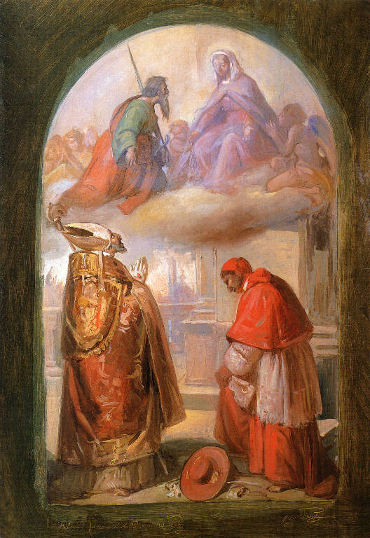 - NOTIZIE STORICO CRITICHE Il dipinto, pervenuto alle raccolte civiche tramite il legato Radlinski del 1977, è il bozzetto della pala che venne commissionata nel 1848 al Cornienti per la chiesa milanese di Sant'Alessandro. L'impegnativo lavoro, ottenuto grazie all'industriale Giovan Battista Brambilla, fu portato a termine dal pittore nel 1850. Oltre al bozzetto, i Musei Civici possiedono un disegno a matita e acquerello, datato 28 giugno 1849, che mostra il dipinto ancora sommariamente abbozzato, collocato nell'atelier romano dell'artista a Santa Maria degli Angeli.