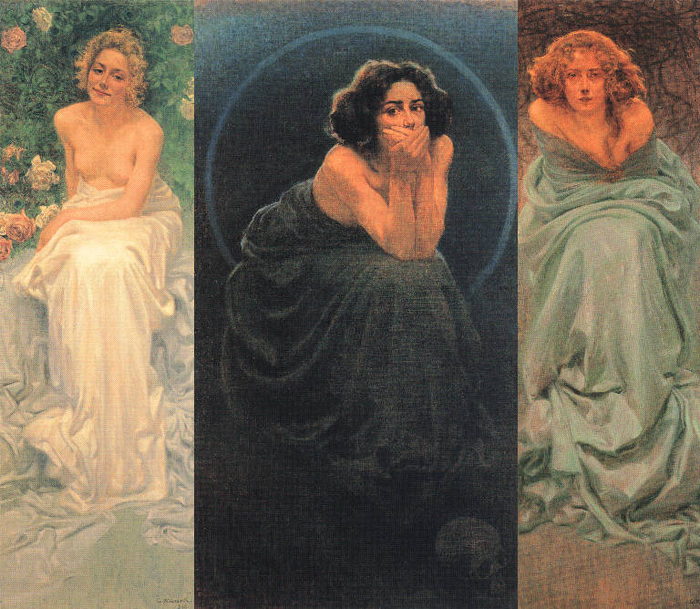- NOTIZIE STORICO CRITICHE Entrati a far parte delle raccolte museali nel 1960, per legato del medico pavese Giuseppe Cortese, i tre dipinti sono stati acquistati nel 1936 dal collezionista direttamente da Giorgio Kienerk. I tre pannelli, datati 1900, comparivano affiancati e riuniti nello studio fiorentino dell'artista e, sempre riuniti e intitolati complessivamente "Enigma umano - trittico", erano ripresi in una fotografia fatta scattare dall'artista e comservata in una collezione pavese. Kienerk, tuttavia, non presentò mai in pubblico il trittico completo, mentre espose i pannelli separatamente. La tela de Il silenzio venne esposta alla Biennale veneziana del 1901 e in seguito riproposta in mostre internazionali; quella del Il dolore comparve all'Espozione nazionale di Pavia del 1913, mentre non fu mai esibito pubblicamente il pannello de Il piacere. Le figure femminili de Il dolore e Il silenzio riprendono da vicino la Beatrice delle illustrazioni per la Divina Commedia, cui Kienerk stava lavorando per conto di Alinari, e tutte insieme si rifanno sia ai modelli internazionali di Muncha e Khnopff, sia al modello di enigmatico fascino proposto da Vittorio Corcos.