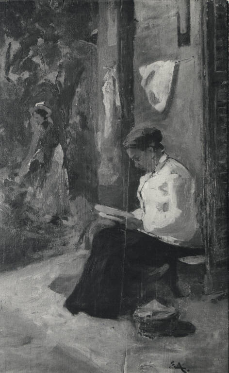 Donna che legge sulla porta di casa. Figura femminile seduta che legge