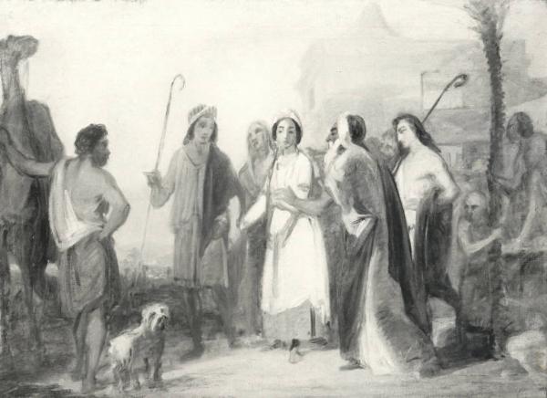 Rebecca presentata da Elizer ad Adamo e Isacco. Rebecca chiesta in matrimonio