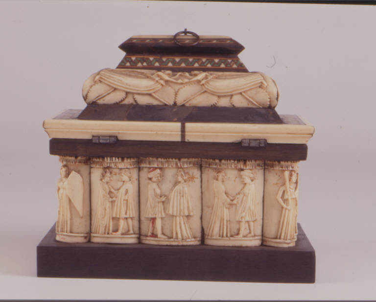 Il cofanetto è rettangolare con coperchio a pagoda costituito da una base piatta con fasce intarsiate alla certosina di osso, legno e corno colorato.