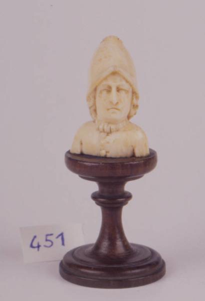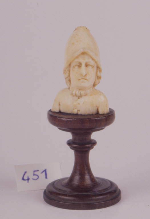 ll busto dell'alfiere in avorio è sostenuto da un piedistallo ligneo tornito.