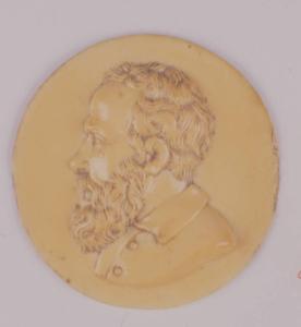 Medaglia di forma circolare che reca il ritratto a basso rilievo di un uomo barbuto.
