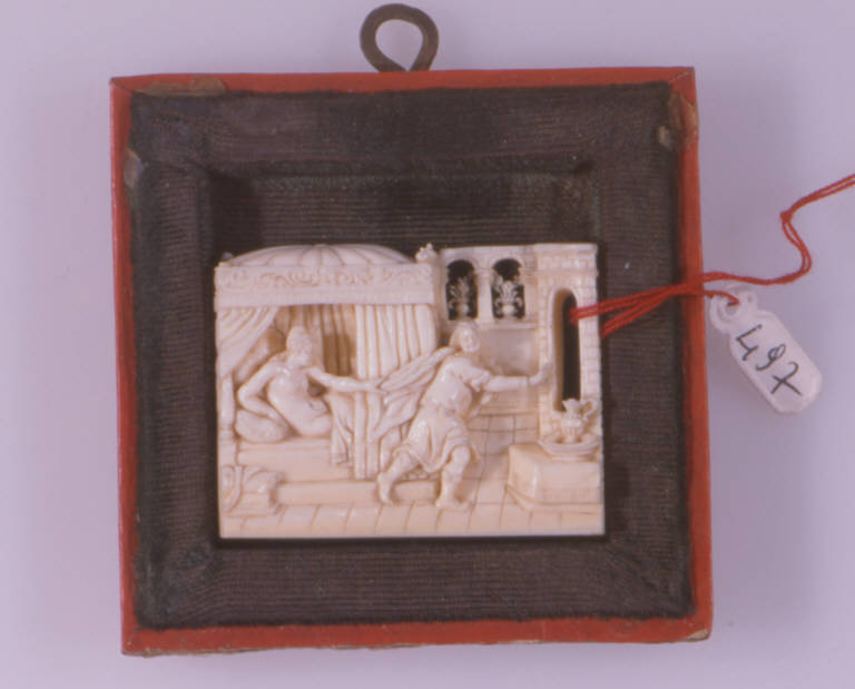 Piastrina in avorio intagliata inserita in una cornice lignea di piccole dimensioni rivestita, in parte, di tela.
