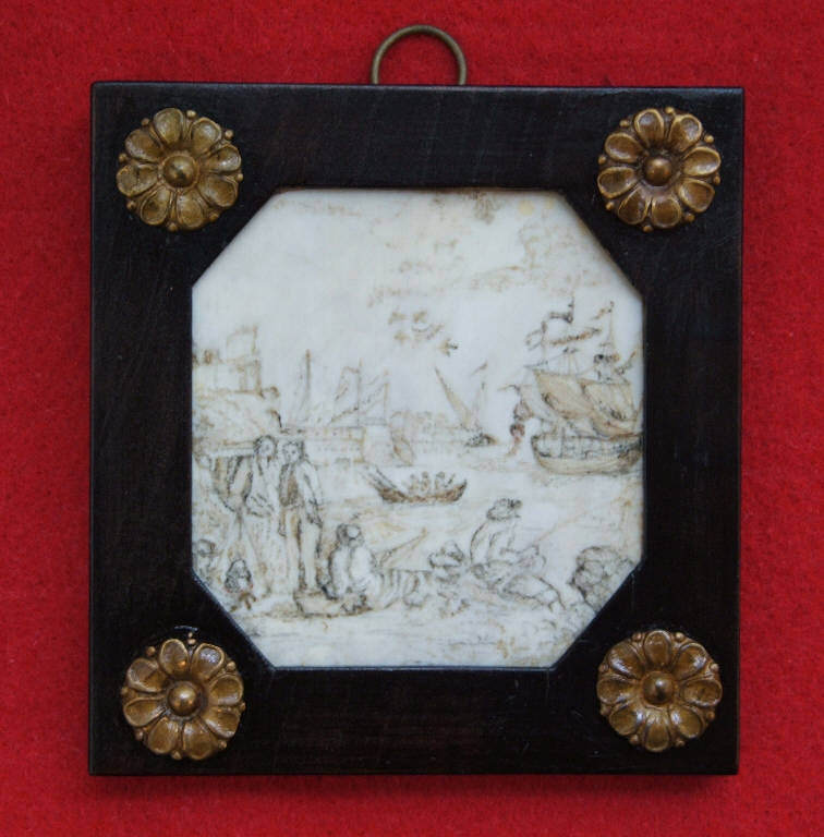La placca di avorio ottagonale è racchiusa entro una cornice quadrata lignea con quattro rosette metalliche negli angoli.