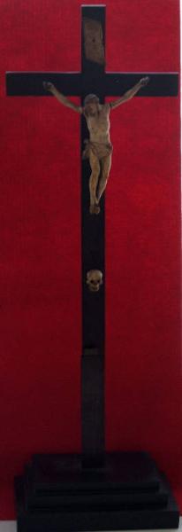 Crocifisso su croce lignea, con teschio ai piedi.
