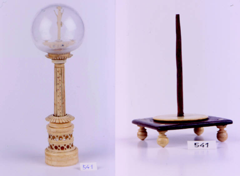 Una base quadrata è sorretta da quattro piedini. Dal suo centro si innalza una struttura cilindrica variamente decorata che si allunga asssottigliandosi. Al culmine si innesta una sfera di vetro contenente un piccolo crocifisso di avorio.