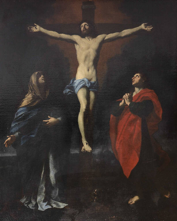 - NOTIZIE STORICO CRITICHE La bella e grande pala si riconosce come copia fedele (anche nelle dimensioni) della Crocefissione dipinta da Guido Reni intorno al 1624-25, già collocata nella cappella del cardinal Gessi nella chiesa romana di Santa Maria della Vittoria, acquistata nel 1856 dal duca di Northumberland per la sua collezione nel Alnwick Castle, \nSi tratta di un modello - a sua volta direttamente derivato, con qualche semplificazione, dalla Crocefissione dei Cappuccini sempre di Reni (1617/18, Bologna, Pinacoteca Nazionale) - divenuto assai noto e replicato in innumerevoli versioni e copie nella pittura dell'età della Controriforma, grazie all'iconografia ridotta ai personaggi essenziali, estremamente pregnanti nei loro atteggiamenti misurati, ben rispondente perciò ad una pittura icastica, sintetica che tralascia il particolare così come il contorno e che si concentra e trasmette significati di forte presa sul pubblico.\nPer le caratteristiche formali - di eleganza - e contenutistiche - di una drammaticità profonda, severa e misurata - il prototipo di Guido Reni aveva conosciuto una grande fortuna, specie nella cerchia dei pittori bolognesi a partire dal secondo quarto del XVII secolo. Tra quelli, potrebbe essere individuato Simone Contarini, artista di formazione tardomanierista marchigiana, sensibile dapprima allo stile del Barocci e di Orazio Gentileschi ma poi affatto conquistato dall'arte del Reni, nella cui bottega bolognese era stato accolto intorno al 1630 e lì aveva operato per qualche anno nella scia di quella cultura artistica; deterioratisi i rapporti con il maestro, il Contarini era tornato nella natia Pesaro, poi aveva soggiornato a Roma per trasferirsi nuovamente a Bologna nel 1642 alla morte di Guido.