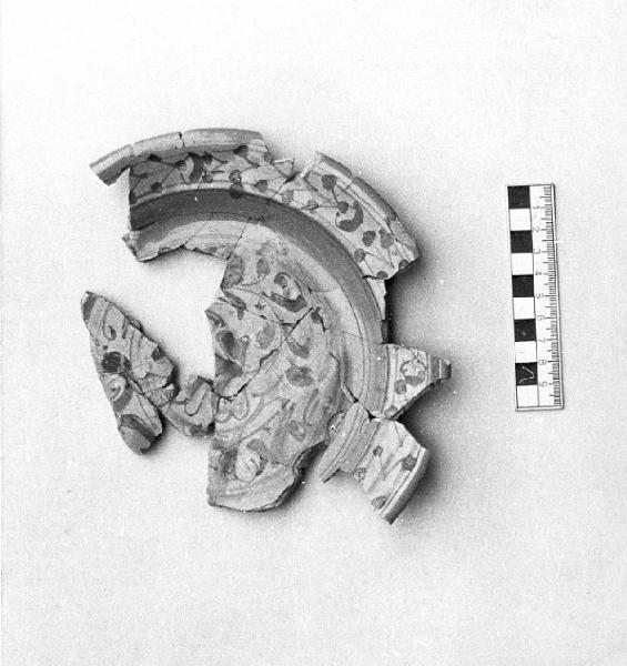 - NOTIZIE STORICO CRITICHE Proviene dagli scavi stratigrafici all'interno della Torre Civica di Pavia (1972-3) (cfr. H. Blake, Scavo nella Torre Civica di Pavia, 1972 in Archeologia Medievale, I, 1974). La decorazione èdel tipo "calligrafico a volute" diffusa a Genova, Savona e Albisola nel sec. XVI.
