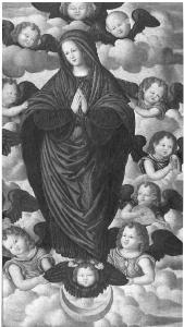 - NOTIZIE STORICO CRITICHE Riprende, pur con moduli rinnovati, uno schema iconografico ricorrente nella pittura lombarda a fresco del '400 (vd. Incoronazione della Vergine a Mirasole e Assunzione nella cappella Portinari del Foppa). Di Mantegna la corona continua di angeli.