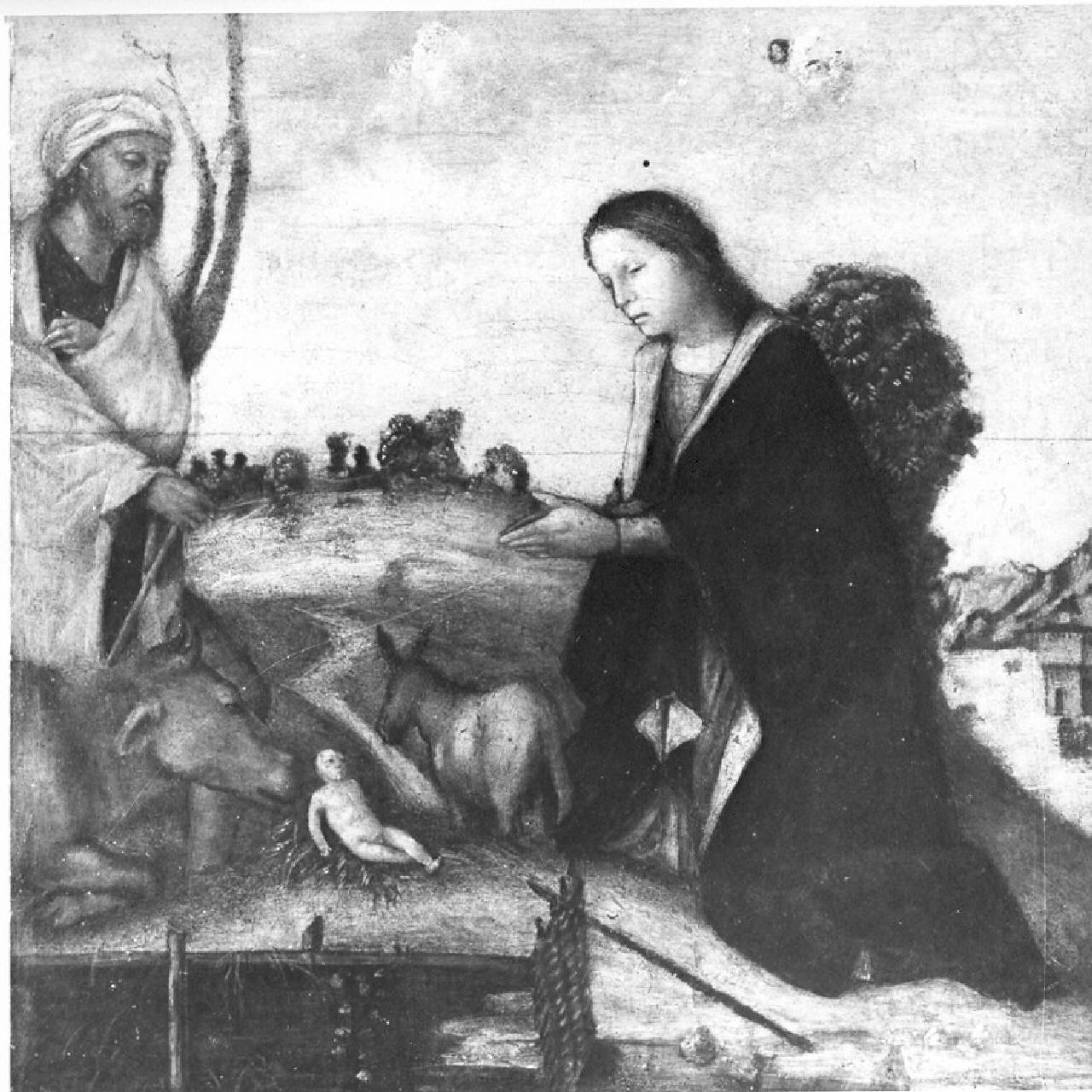 - NOTIZIE STORICO CRITICHE La tavola, rimpicciolita, è stata giudicata dal Panazza (Dipinti bresciani inediti del Rinascimento, Roma 1962; vd. anche La pittura nella seconda metà del '400, 1963 in Storia di Brescia) un dono nuziale per la presenza delle insegne, di cui una della famiglia Belasi, e confermerebbe il rferimento al Ferramola che fu autore di cassoni nuziali. Il riferimento fopesco evidente e l'attenzione per il paesaggio fuggente che si riscontra nella Madonne dell'artista (vd. Berlino e Poldi Pezzoli) compare anche negli affreschi già in Palazzo Borgondio di Brescia, ora alla Tosio Martinengo e in Inghilterra.