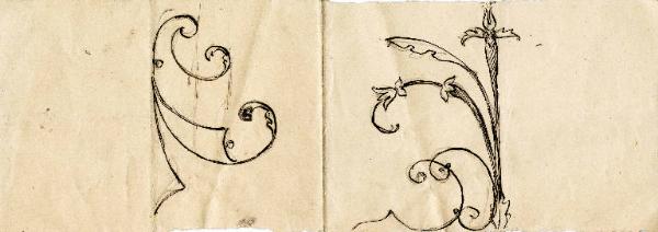 schizzi per cancelli, decorazioni con volute e motivi floreali e appunti dicalcoli sul verso
