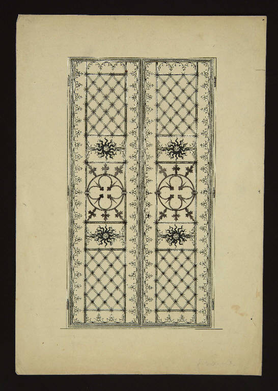 Prove per cancello con elementi decorativi floreali e vegetali. Al centro due cerchi e due quadrlobi con punzoni. In alto e in basso del disegno stampato motivo decorativo a grata.