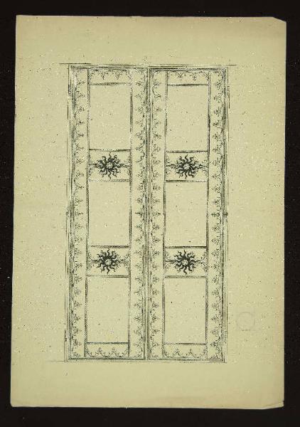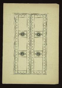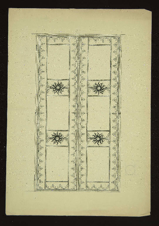 Prove per cancello con elementi decorativi floreali e vegetali. Indicazioni di misure in basso e al lato destro del disegno. Tracce di disegno a matita in alto a sinistra.