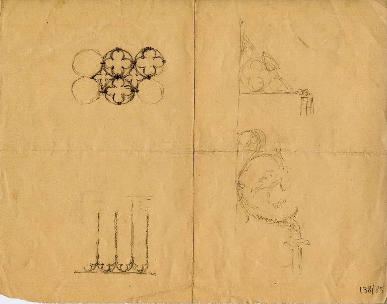 schizzi di particolari decorativi per cancello e sul verso particolare del quadrilobato.