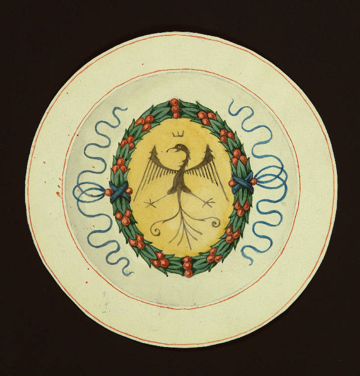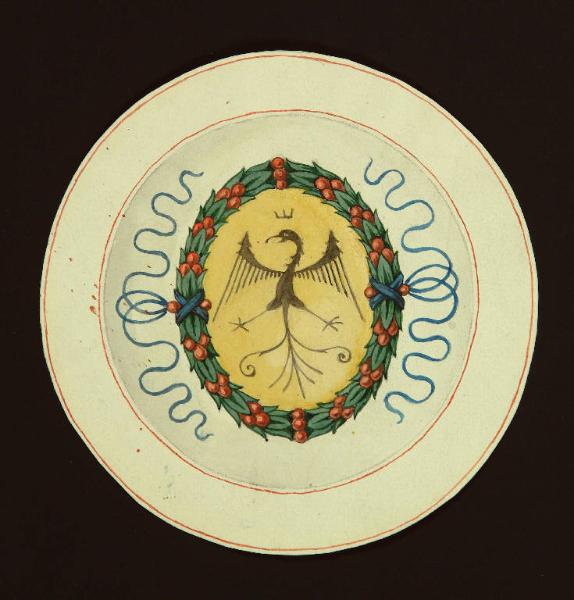 disegno dcorativo per piatto con stemma del Bagatti Valsecchi. Motivo decorativo vegetale con perline gille, nastro rossoe al centro il giglio. Schizzo di motivo floreale sul verso.