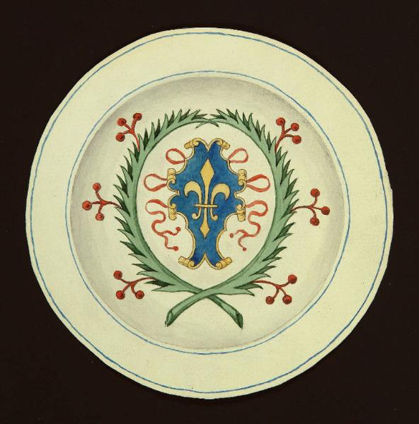 disegno dcorativo per piatto con stemma del Bagatti Valsecchi. Motivo decorativo vegetale con perline, nastro blu e al centro un'acquila nera. Schizzi a matita di motivi decorativi per stema sul verso.
