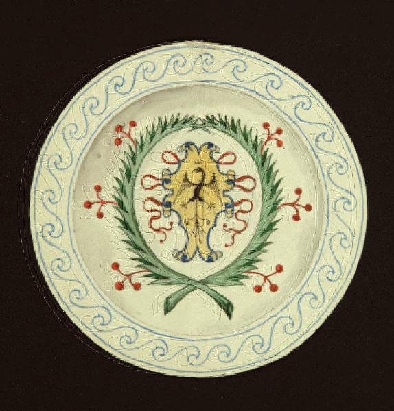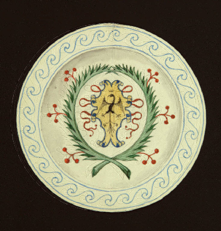 disegno dcorativo per piatto con stemma del Bagatti Valsecchi. Motivo decorativo vegetale con perline gille, nastro rosso e al centro il giglio.