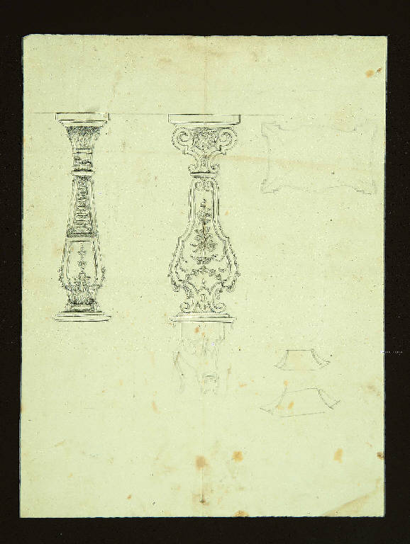 disegno di una porta del salone della Casa Bagatti Valsecchi in stucco e patinato per simulare la pietra del camino. Stipitie lesene decorati da elementi strumentali, trofei d'armi e da elementi classici. Il fregio è sormontato dallo stemma dei Bagatti Valsecchi. Sul verso traccia della facciata del Palazzo Bagatti Valsecchi con torretta.