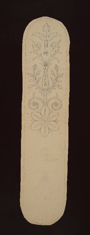 estremità superiore e inferiore del foglio centinate; linea ondulata che corre lungo tutto il profilo del foglio; parte inferiore della decorazione solo in parte abbozzata; sul verso schizzi di decorazione a candelabra; fori da spillo