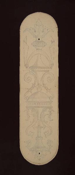 estremità superiore e inferiore del foglio centinate; linea di profilo lungo tutto il bordo del foglio; elementi chiaroscurati; due piccole sagome ovali ritagliate; fori da spillo