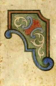 acquerellatura rosa, verde e azzurra; in basso a destra, prova di scrittura a inchiostro rosso
