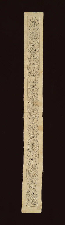 - NOTIZIE STORICO CRITICHE Il disegno rappresenta una delle lesene delle porte del Salone, realizzate nel 1884 in stucco patinato a imitazione del legno, con decori neorinascimentali. Il foglio qui schedato, in particolare, raffigura quella a posta a destra della porta a sinistra del tavolo (che conduce verso lo scalone d'ingresso). Una delle lesene (sia nel disegno che nella realizzazione in stucco) porta la data 1883, mentre la bibliografia relativa (Pavoni 2003, p. 21) colloca l'esecuzione del complesso nel 1884: si è dunque data come collocazione cronologica del disegno il biennio 1883-1884.